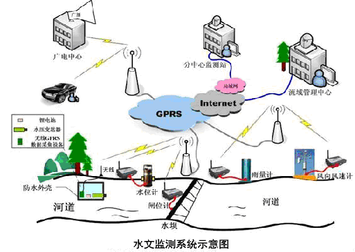 遠程水文在線監測系統由監測中心、通信網絡、前端監測設備、測量設備四部分組成。